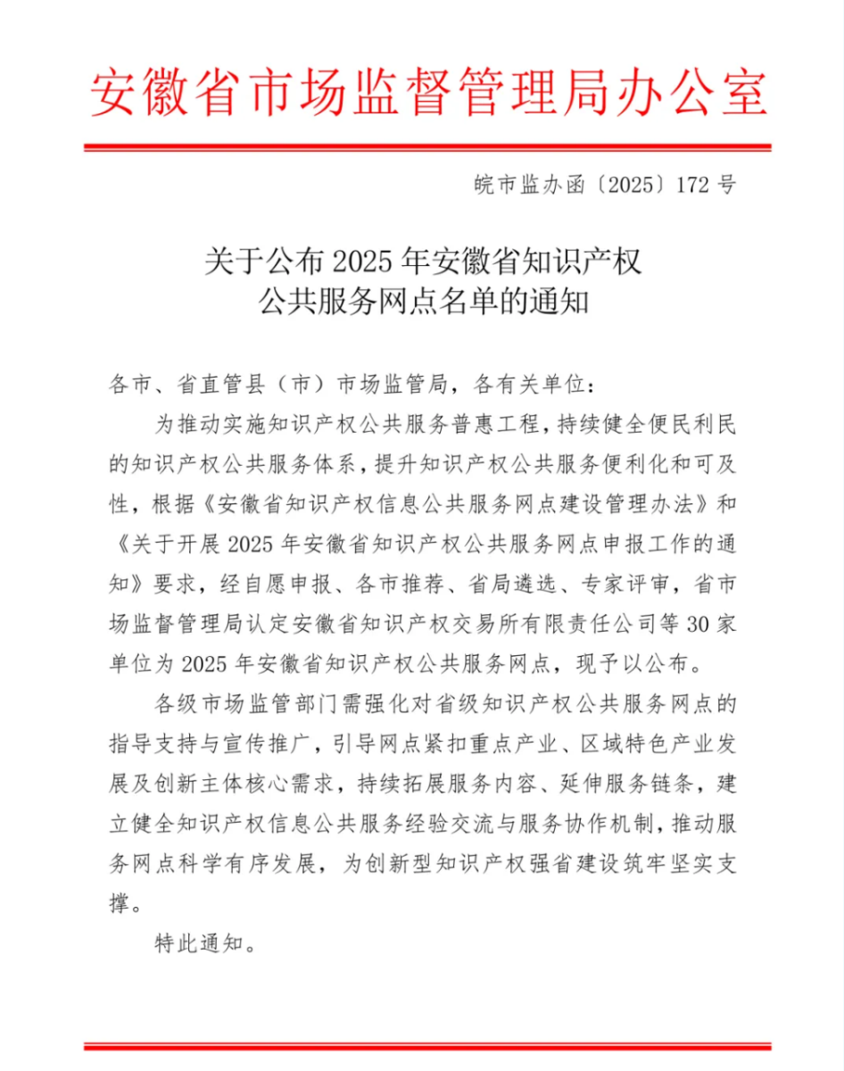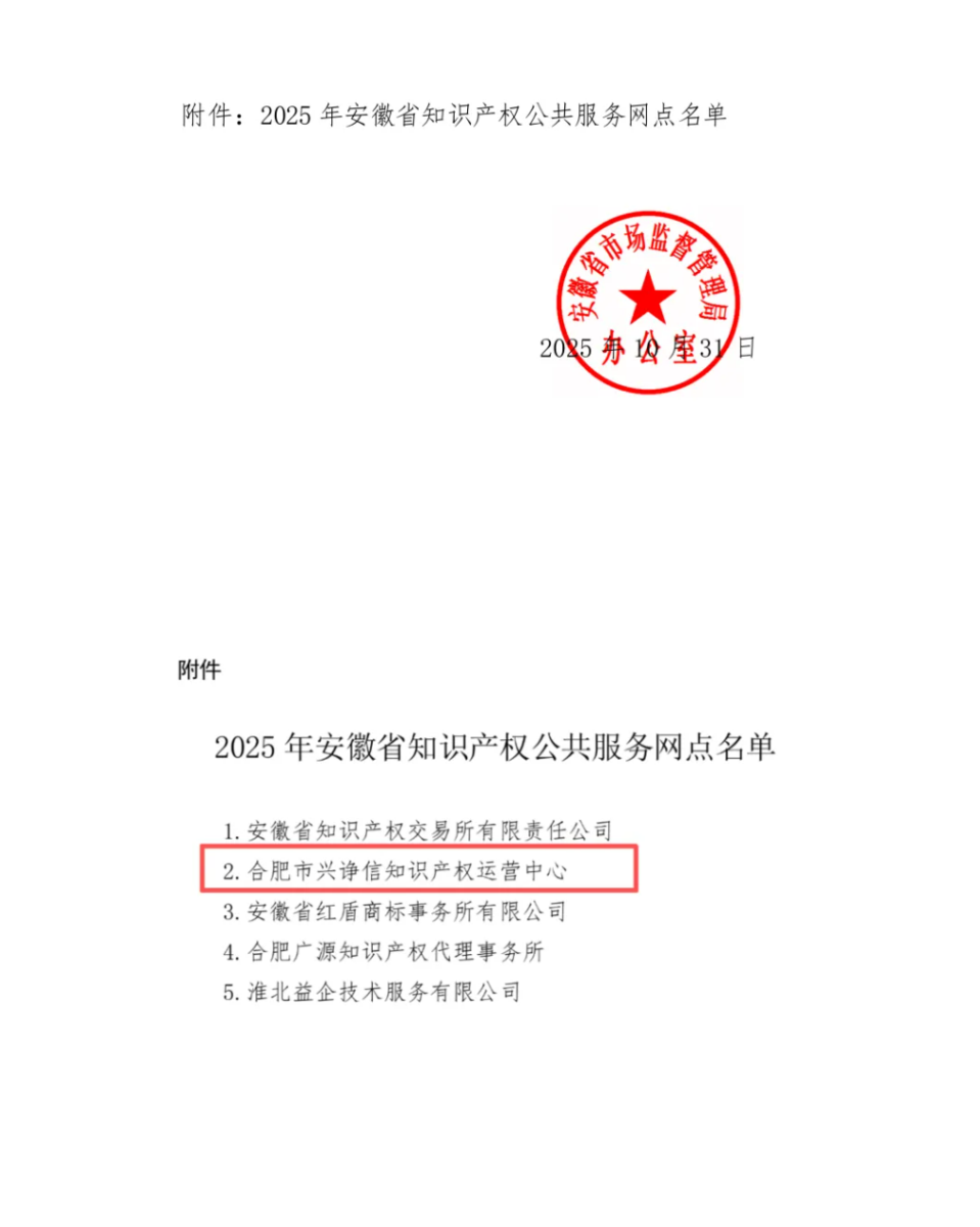 合肥市興凈信知識產權運營中心成功入選2025年安徽省知識產權公共服務網點